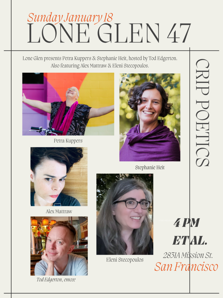 Readings by Stephanie Heit, Petra Kuppers, Alexandra Mattraw & Eleni Stecopoulos with Tod Edgerton as emcee